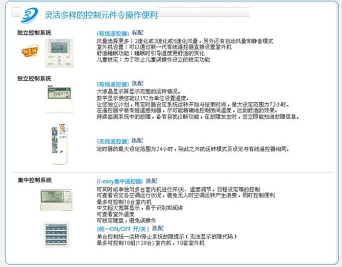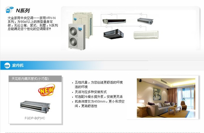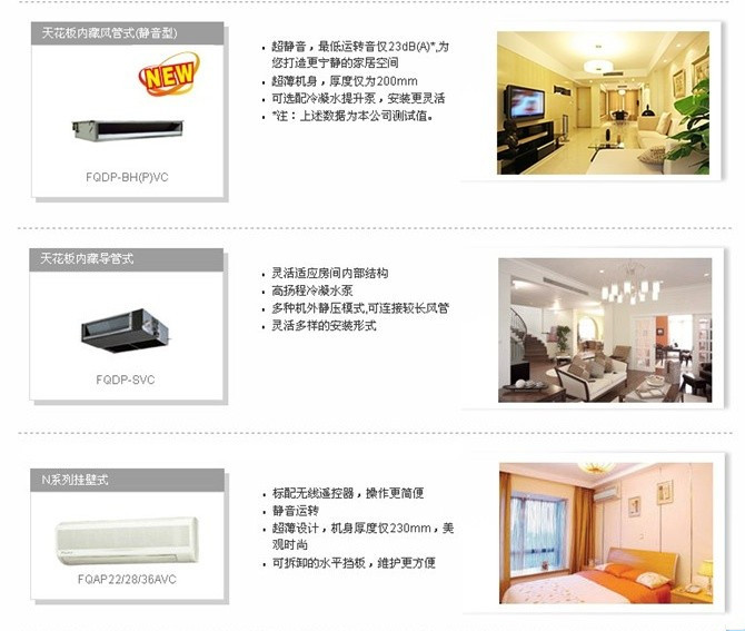 新款上市的”高效耐久廚房專用機組“、”衛浴用嵌入式“、”溫濕平衡3D氣流風管式“、‘PM2.5凈化超薄風管式’、‘純效新風凈化超薄風管式’的大金全效中央空調,突破以往空調的限制,從”溫度、濕度、氣流、清潔度“,四維一體的全效空氣調節,賦予家用中央中央空調全新定義。